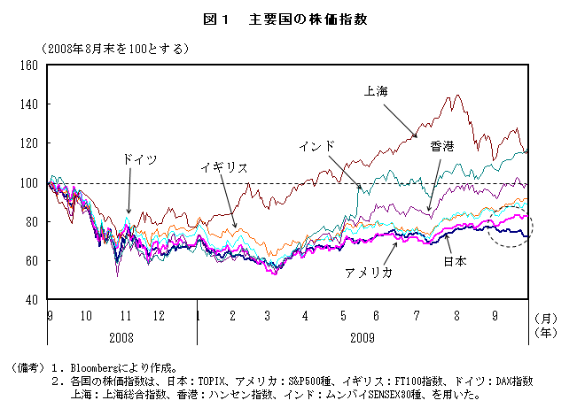 2.リーマンショック以降の主要国株価の動きを見ると、落ち込みからいち早く株価が上昇したのは中国およびインドといった新興国であり、09年中ごろまでにはショック前の水準に回復している。